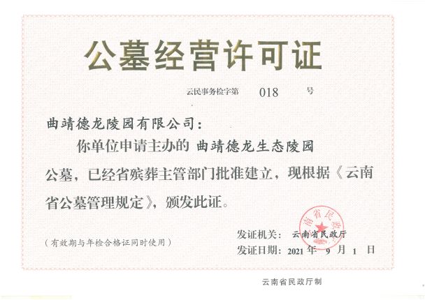 德龍園聚翠山之靈秀,依文脈而規(guī)劃,經(jīng)云南省民政廳批準建設,規(guī)劃用地一共520畝,經(jīng)過精心設計,精細施工,于2021年9月取得《公墓經(jīng)營許可證》并投入使用。